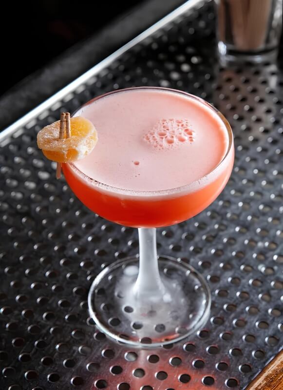 作法:將所有材料放入shaker中使用搖盪法製作, double strain倒入雞尾酒杯,可用一小塊薑糖裝飾。