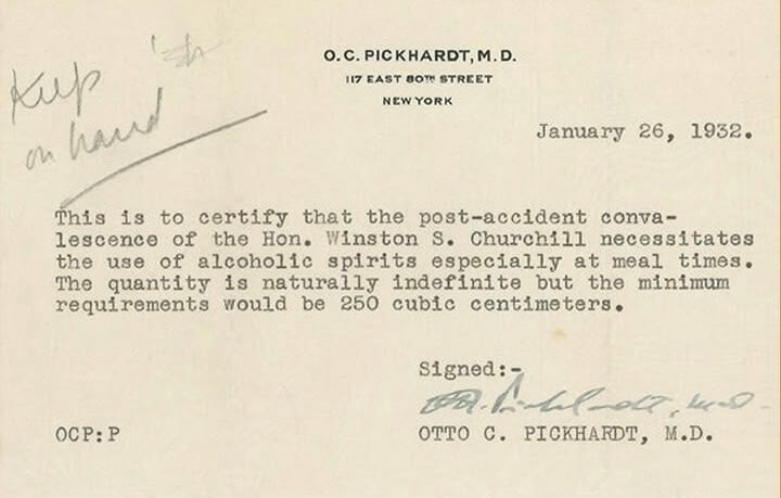 這時候就要回到1932年的禁酒令時期,當時尚未擔任首相的邱吉爾,在紐約拜訪途中遭遇車禍,而向美國醫生要求開立「作為止痛用途」的處方簽;醫生同意他因「醫療需求」飲酒,而且在處方簽中寫著: