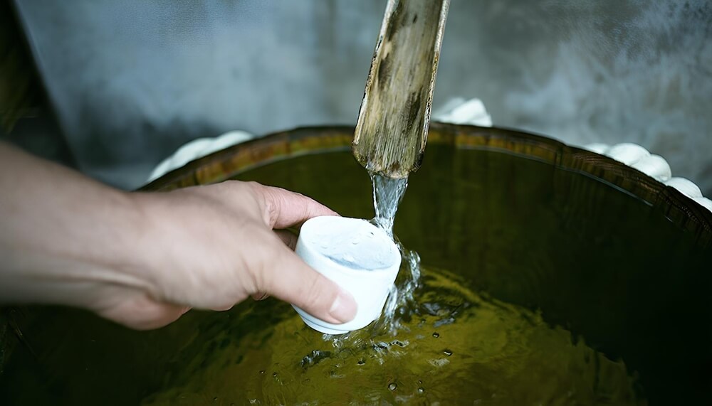 京都伏見區自古就以多道湧泉著稱,其中唸得出名號的就多達7處,其中在御香宮神社內的「御香水」更是日本名水百選之一。伏見的湧泉水經過花崗岩層濾過,硬度約為60–80mg/L,屬於中硬水且偏軟,礦物含量平衡、鐵分低,使發酵相對緩和,香味與旨味沉穩,口感柔和細膩。