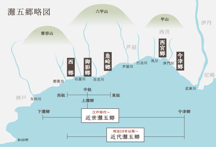 兵庫縣神戶市與西宮市沿岸的「灘五鄉」,自江戶時代就是日本最大清酒產地。日本最大的幾間日本酒品牌,包括:大關、白鶴、黑松白鹿、劍菱,這些酒造的生產基地也都在位於西宮市的灘區。