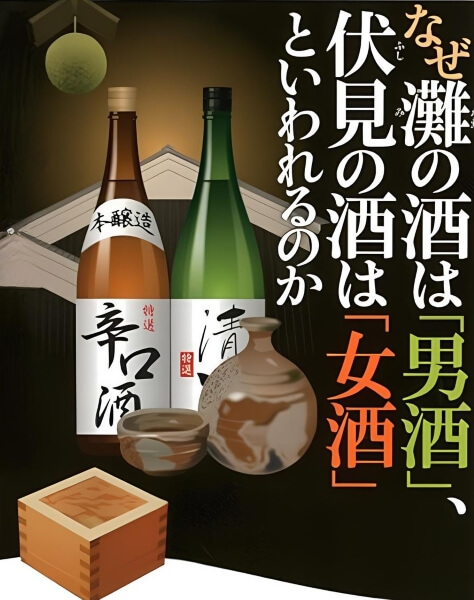 在形容日本清酒風味的時候,常常會聽到這樣的一句諺語:「灘の男酒、伏見の女酒」,這句話是形容兩大日本酒產區:位於兵庫縣西宮市的「灘」、以及位於京都市南部的「伏見」,因釀造水質差異所形成的風味分野。