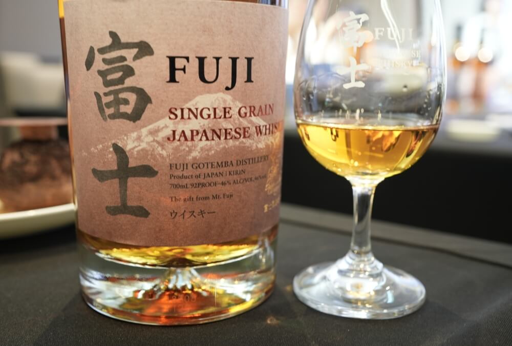 富士單一穀物威士忌是相當複雜的酒款,分別使用美式、加拿大式、及蘇格蘭式三種穀類威士忌製作方式後進行調和。帶有香甜水果、覆盆紫、橘子果醬、以及滿天星類的白色花香,口感相當飽滿而且濃郁;加些水後香氣更加濃烈、水果風味更加突出,是相當適合加冰、或是水割飲用的酒款。