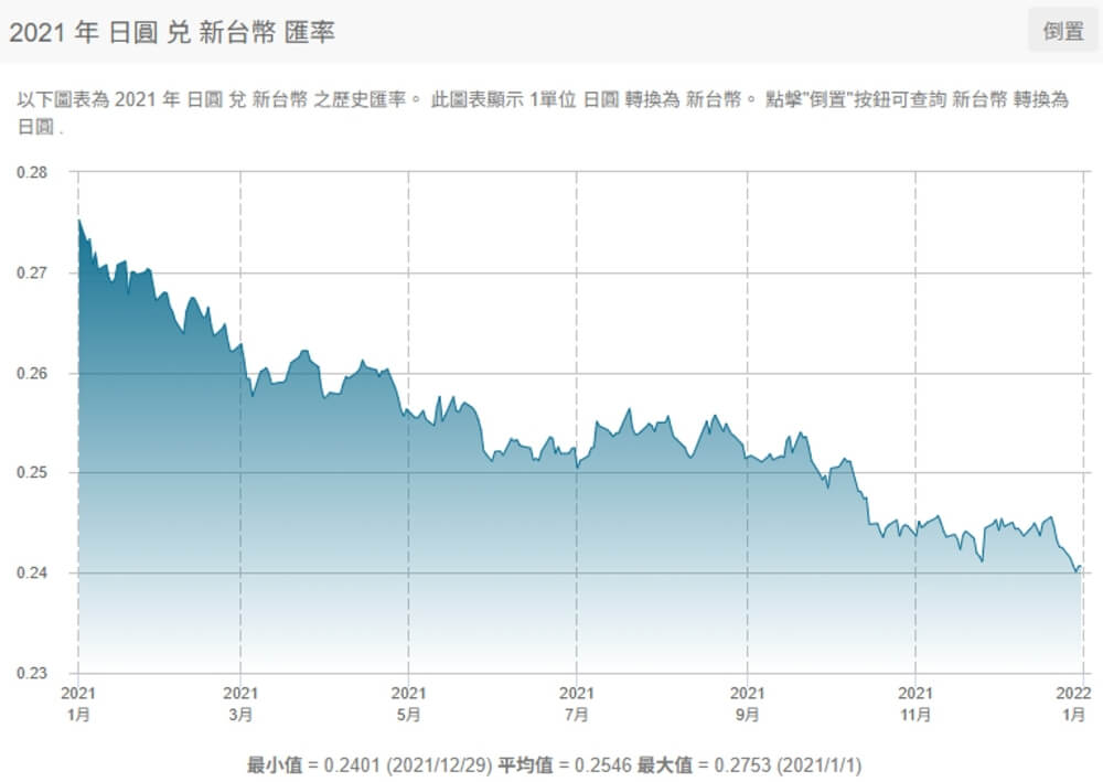 由2021至2025之間,日圓兌新台幣匯率出現明顯變動,累積貶值幅度約23%。直接看看數據,2021年日圓兌新台幣約為0.2546(大約從0.275掉到0.24,我們就取個平均值),2021年當時折合約新台幣140元,而同樣的日幣售價2026年的現在約為新台幣110元,有30元的價差。