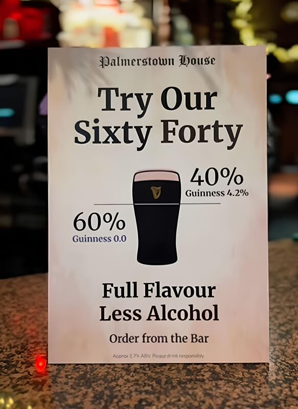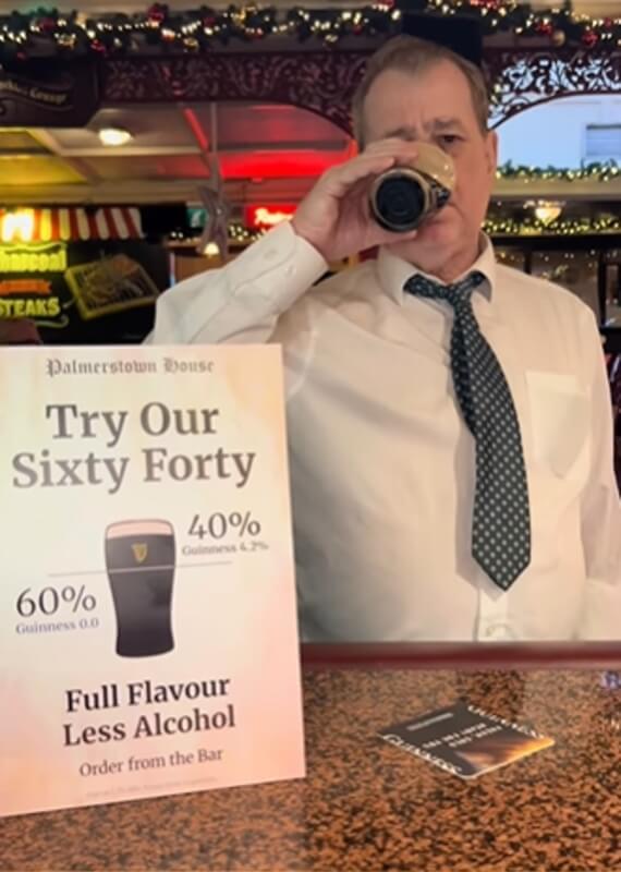 先前位於都柏林市郊的Palmerstown House Pub在IG上發布了一支短片,影片的一開頭寫著「試試看我們的特調 Guinness 60/40倒法,風味更完整,酒精更少。」接下來就是先在Guinness杯子內倒入60%無酒精健力士、再倒入40%的原版黑啤。這段影片發佈之後,讓這個原來只有3,000追蹤人數的IG帳號,短短8週累積50萬次觀看。